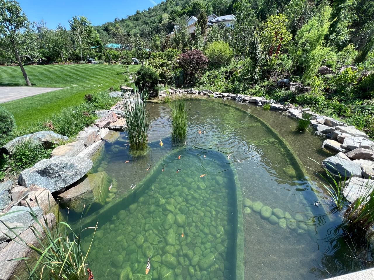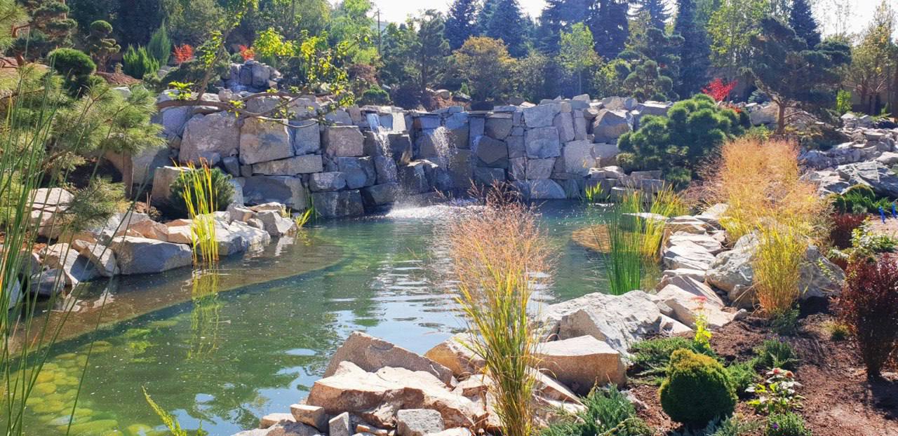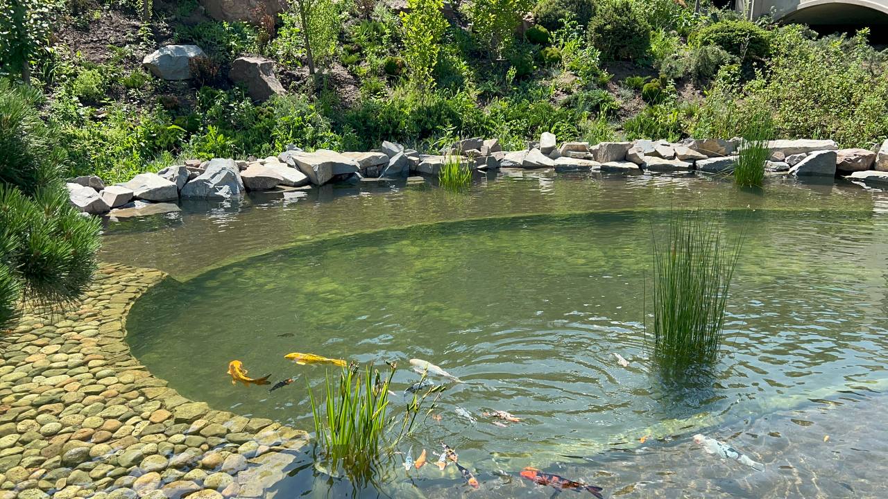 Декоративный водоём, состоящий из двух чаш, размещённых на разных уровнях, с водопадом и каскадным ручьём. Общая площадь — около 900 м². Пруд заселён японскими карпами кои.