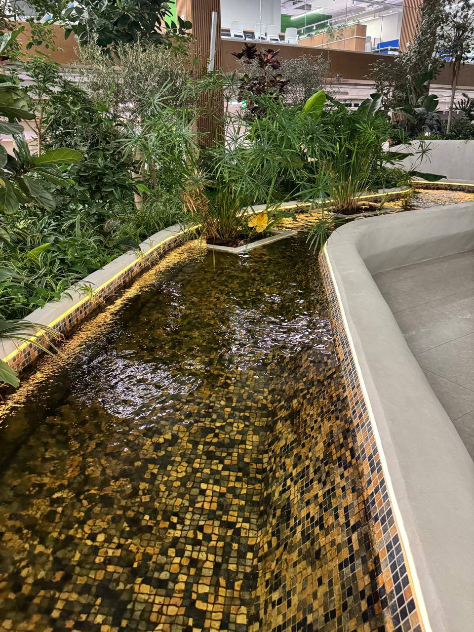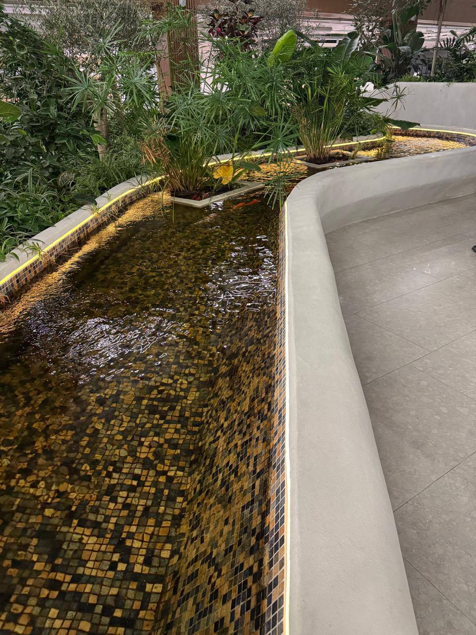 Чаша из бетона, отделана обмазочной двухкомпонентной гидроизоляцией и мозаичной плиткой.