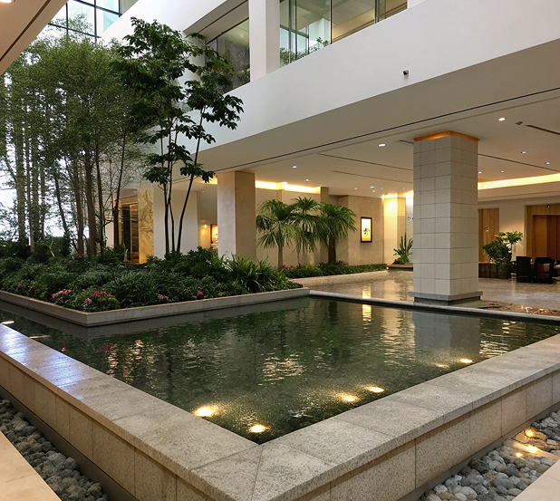 водоёмы/пруды для помещений (атриумы, холлы, зимние сады) с бесшумной циркуляцией, подсветкой и безопасной гидроизоляцией.